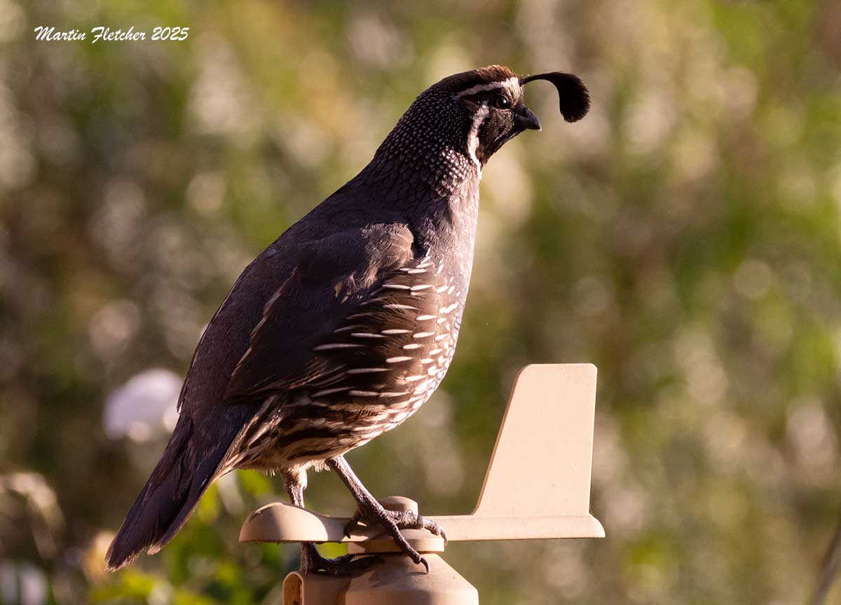California Quail in sentry mode on a weathervane, private residence, Ojai, CA.
